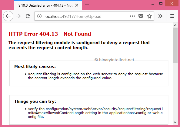 To change the settings at the activity level you need to use ii attributes namely [RequestSizeLimit] and [RequestFormLimits]. The [RequestSizeLimit] attribute sets the maximum length of a request in bytes whereas [RequestFormLimits] sets the maximum length for multipart trunk length. The following code shows the Upload() action busy with these attributes: